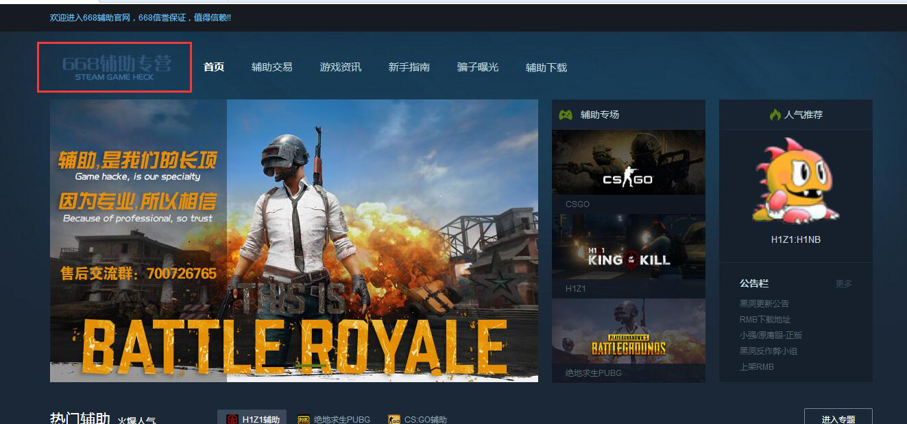描述:668游戏网是集H1Z1辅助,绝地求生辅助,CS:GO等主流游戏辅助为一体的交易平台,我们秉承信誉第一以创新稳定为前提帮助更多的玩家体验游戏的快乐,不给客户造成任何损失。以便捷、安全、诚信的交易体验,为您提供智能,专业,人性化服务。